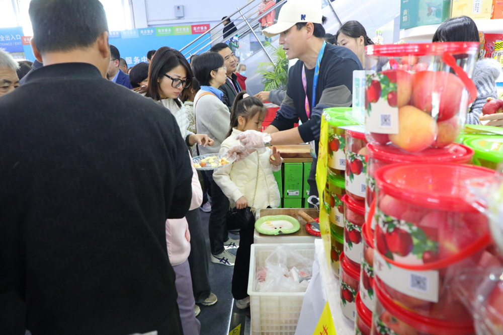 走进宜君县展厅,宜君县皇后生态农业有限公司总经理谭战的展位前始终是“热门打卡点”——工作人员的水果刀几乎没停过,刚切好的“香妃”苹果块递到参会者手中,酸甜多汁的口感瞬间引发好评,“果肉脆嫩,果香浓”“甜度刚好,不腻口”的夸赞声此起彼伏。参会者吃完还围着工作人员追问:“这苹果怎么卖?”“包装能拆开看吗?”,连给展台补货的间隙都没有,工作人员只能一边快速递出“有福同享”包装桶,一边大声回应咨询,嗓子都有些沙哑。