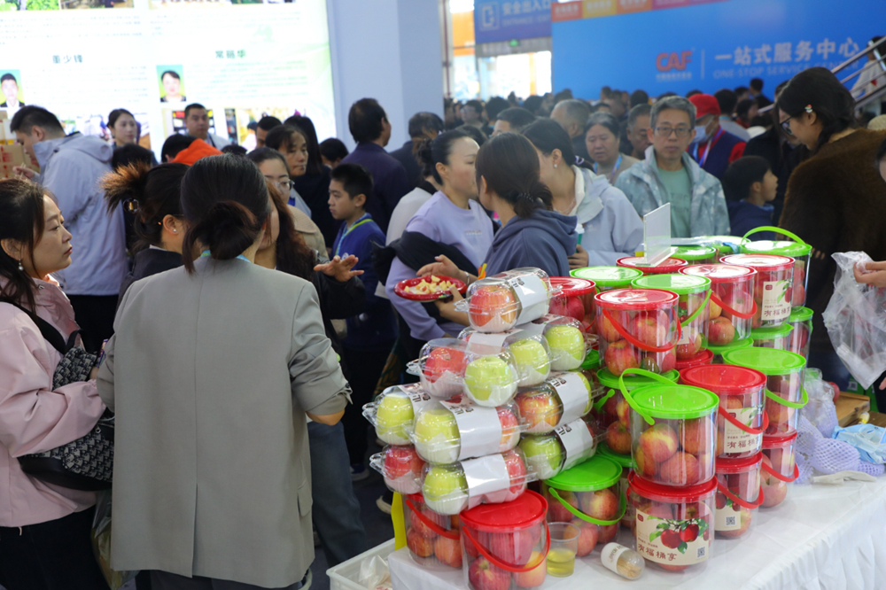 “我每年都参加农高会,今年我带来了两个‘新’。”谭战在采访时说,“第一个‘新’是苹果新品种香妃,果子大小适中,小朋友一手就能握住,每一口都是清甜果香,精准贴合大众对优质苹果的期待;第二个‘新’是包装创新推出的‘有福同享’系列,还寓意着有福与铜川人民一起享,在农高会上卖了500多桶。”