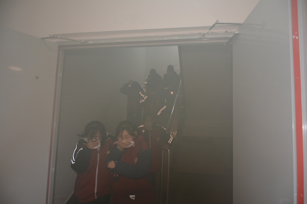 18:30,演练信号准时发出,全体师生严格按照消防疏散流程,在工作人员的引导下低姿、快速、有序撤离,整个过程衔接顺畅、秩序井然,高效完成了疏散任务。随后,军管处张教官详细讲述了消防器材使用方法。